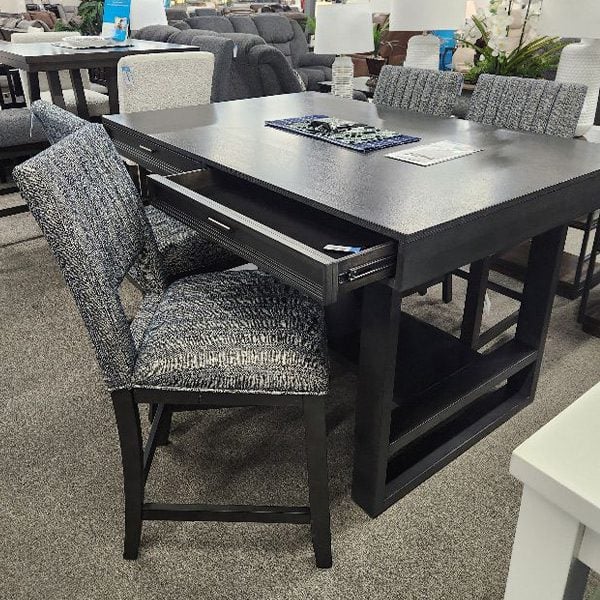 This stylish counter-height dining set blends practicality with charm. The gray wood table includes two drawers on each side, ideal for storing napkins or dining accessories. Paired with four 24” stools in blue and gray fabric, it’s the perfect fit for kitchen dining or casual entertaining.