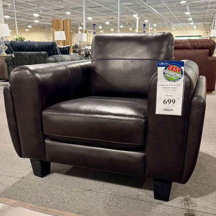 Upholstered in rich mocha leather, this chair features a deep, supportive seat and wide, padded arms for comfort you can sink into. Its timeless design blends beautifully with classic or modern décor, making it a versatile addition to any room.
